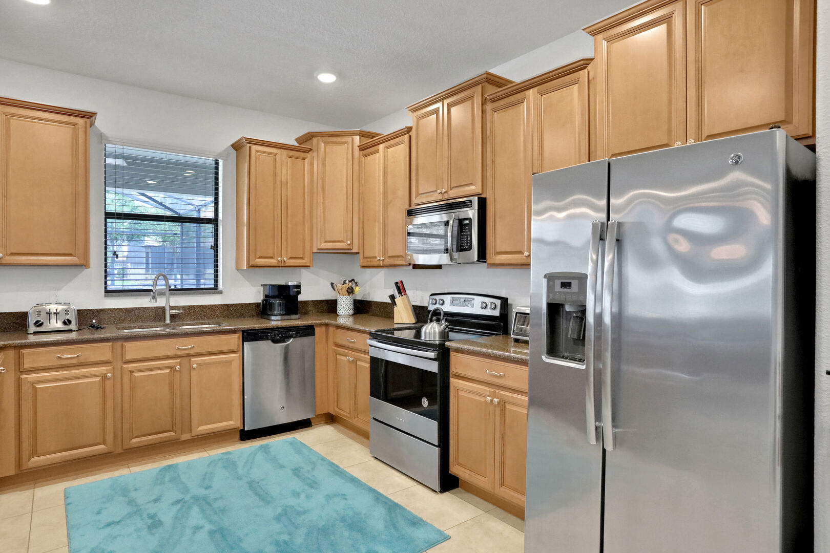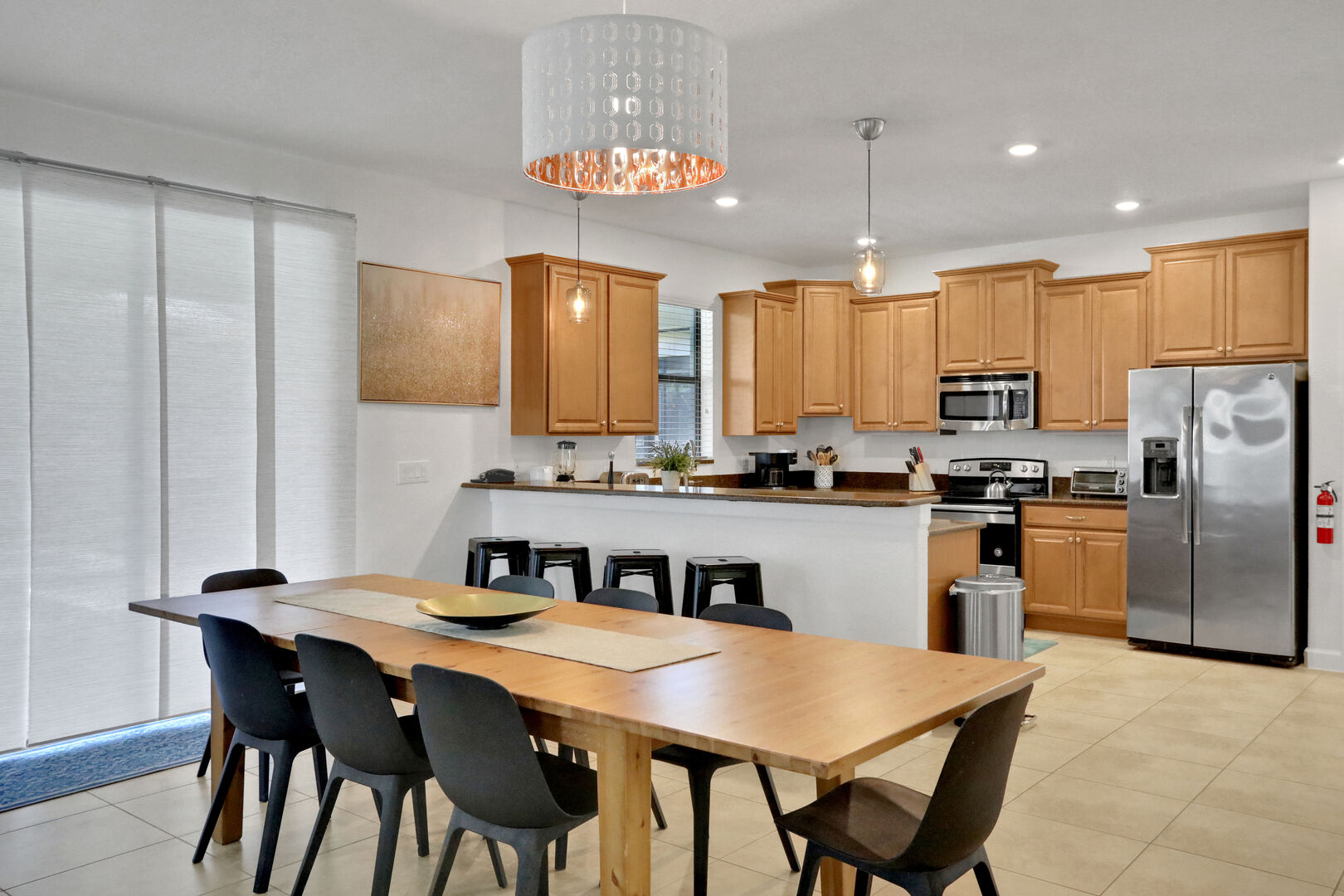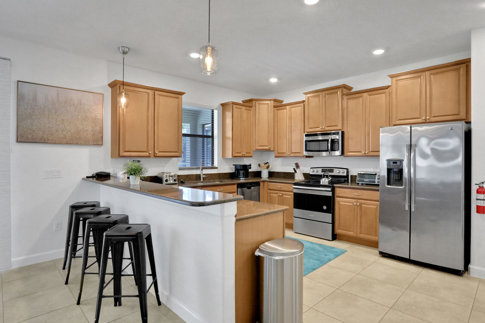 Step inside and be greeted by a warm and inviting ambiance, featuring modern decor and ample natural light. The open-concept living area is perfect for relaxation, complete with comfortable seating and a large flat-screen TV for your entertainment needs. The fully equipped kitchen boasts high-end appliances, including a refrigerator, microwave, dishwasher, and coffee maker, along with all the necessary utensils and cookware to prepare delicious meals. Enjoy your culinary creations at the dining table that comfortably seats everyone.