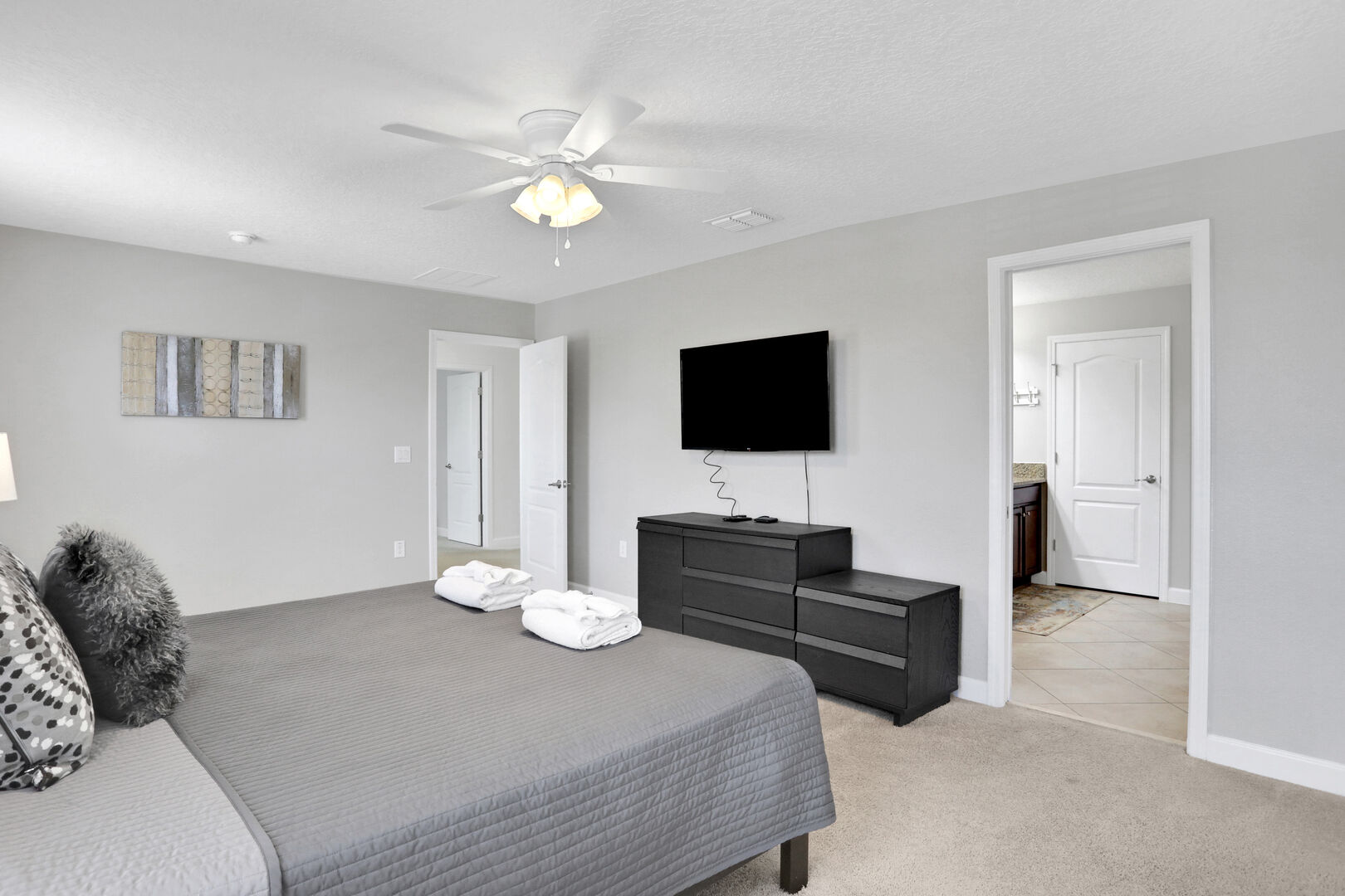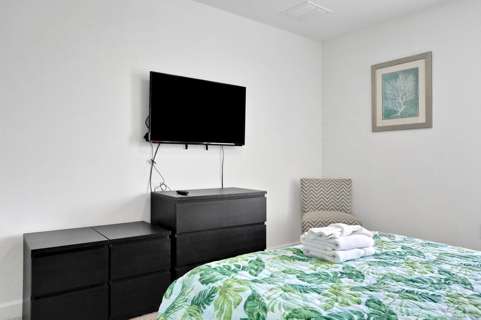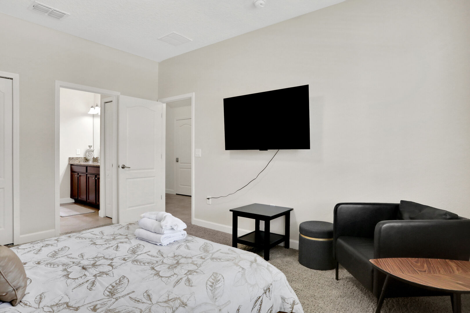 Step inside and be greeted by a warm and inviting ambiance, featuring modern decor and ample natural light. The open-concept living area is perfect for relaxation, complete with comfortable seating and a large flat-screen TV for your entertainment needs. The fully equipped kitchen boasts high-end appliances, including a refrigerator, microwave, dishwasher, and coffee maker, along with all the necessary utensils and cookware to prepare delicious meals. Enjoy your culinary creations at the dining table that comfortably seats everyone.