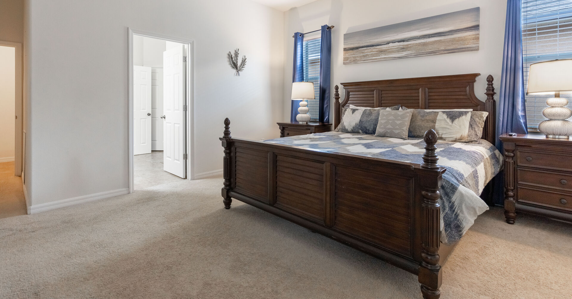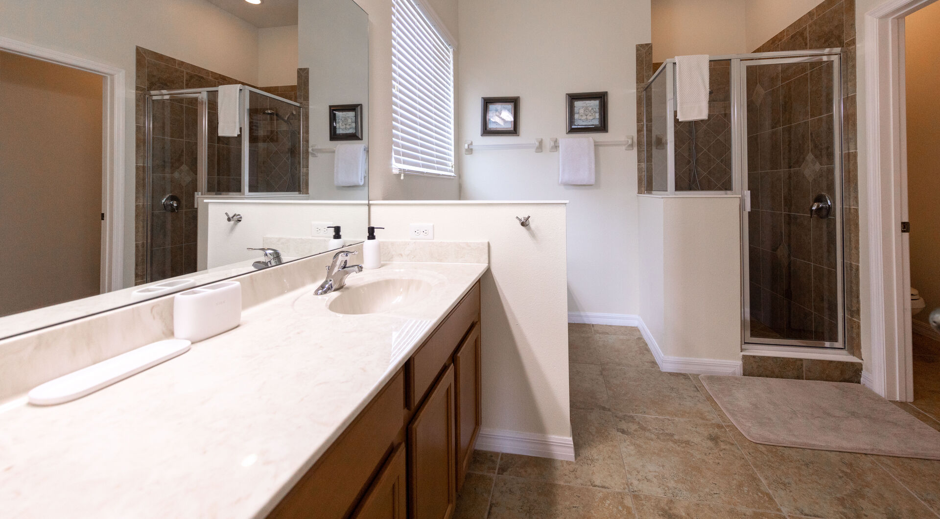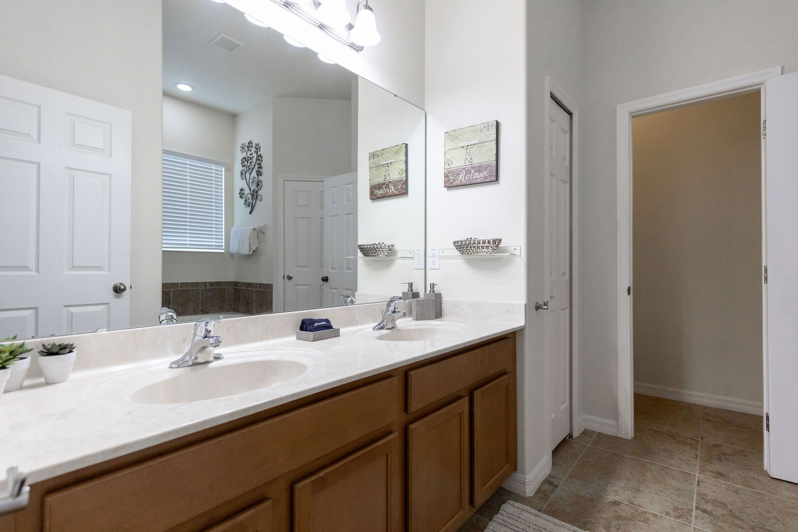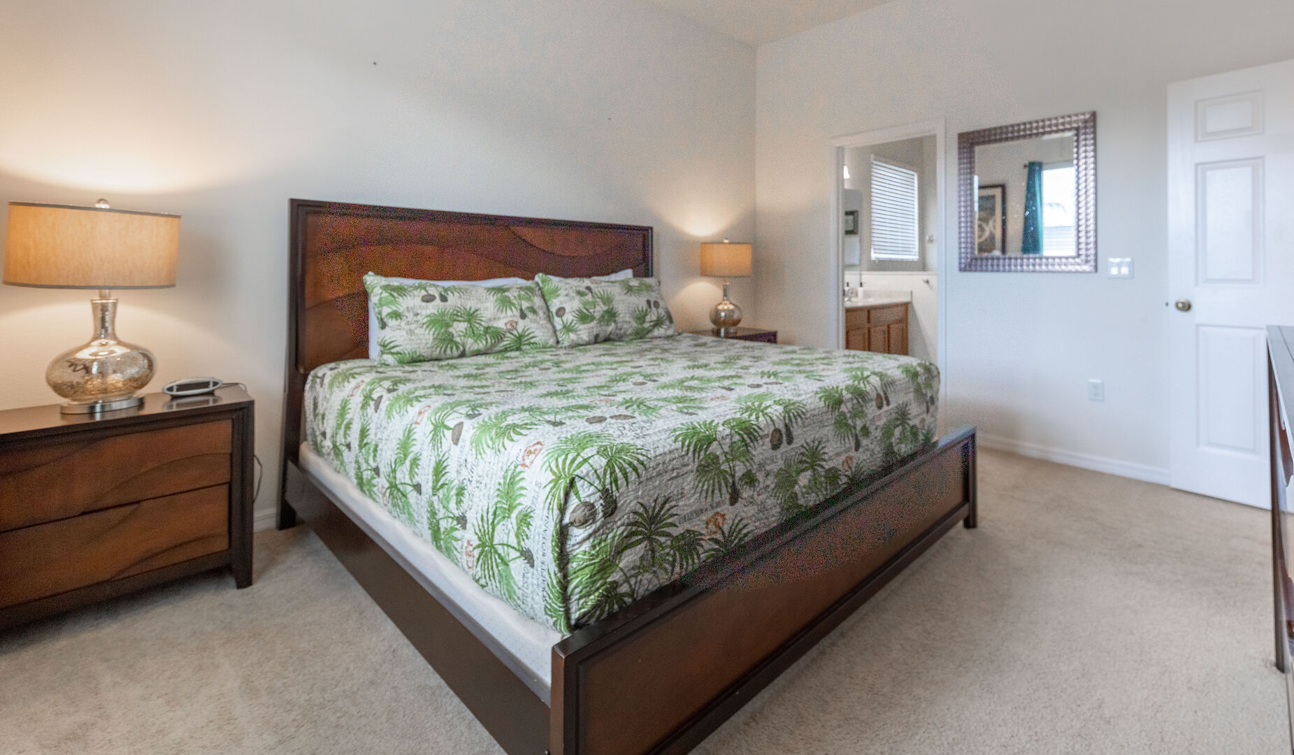 The luxurious master suite features a spacious bedroom, and an en-suite bathroom with large vanity, a tub, and a separate shower.